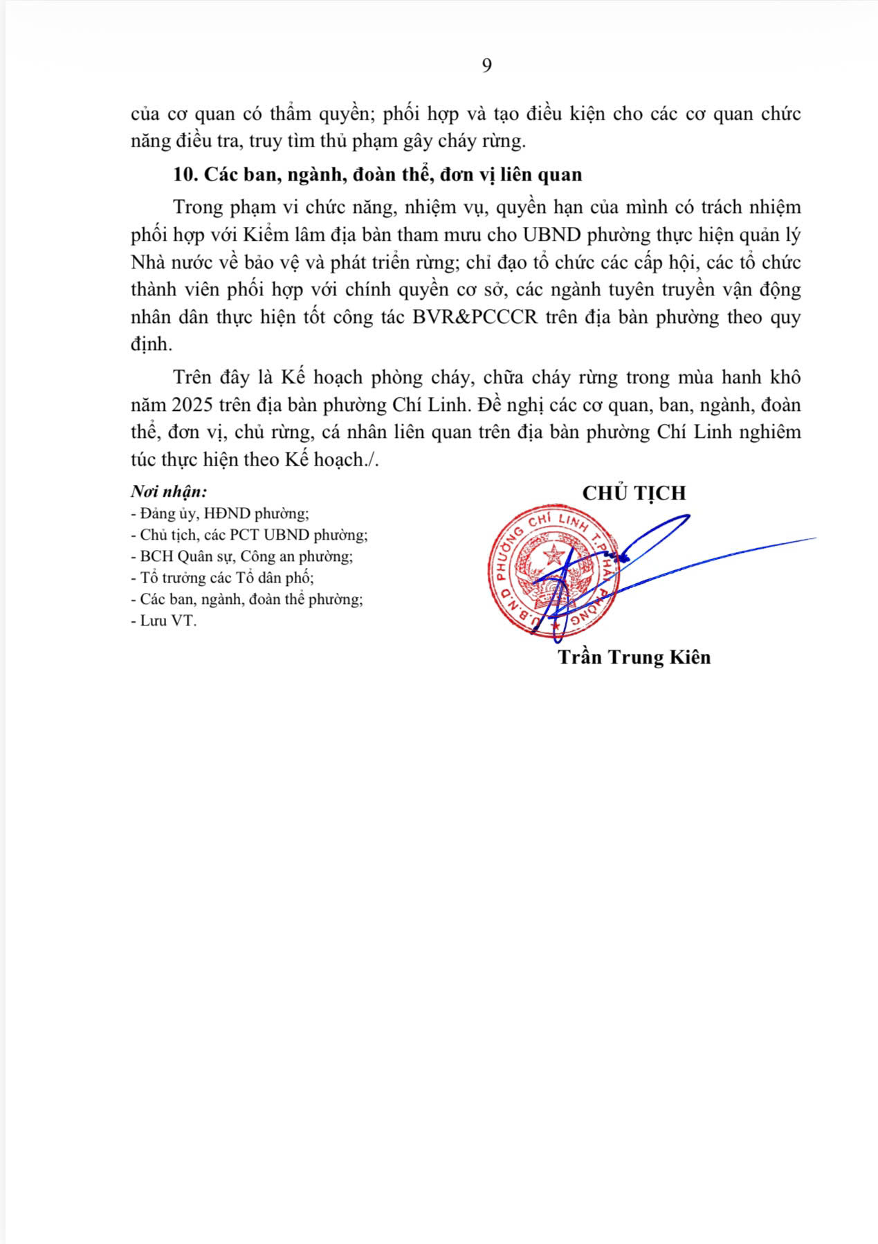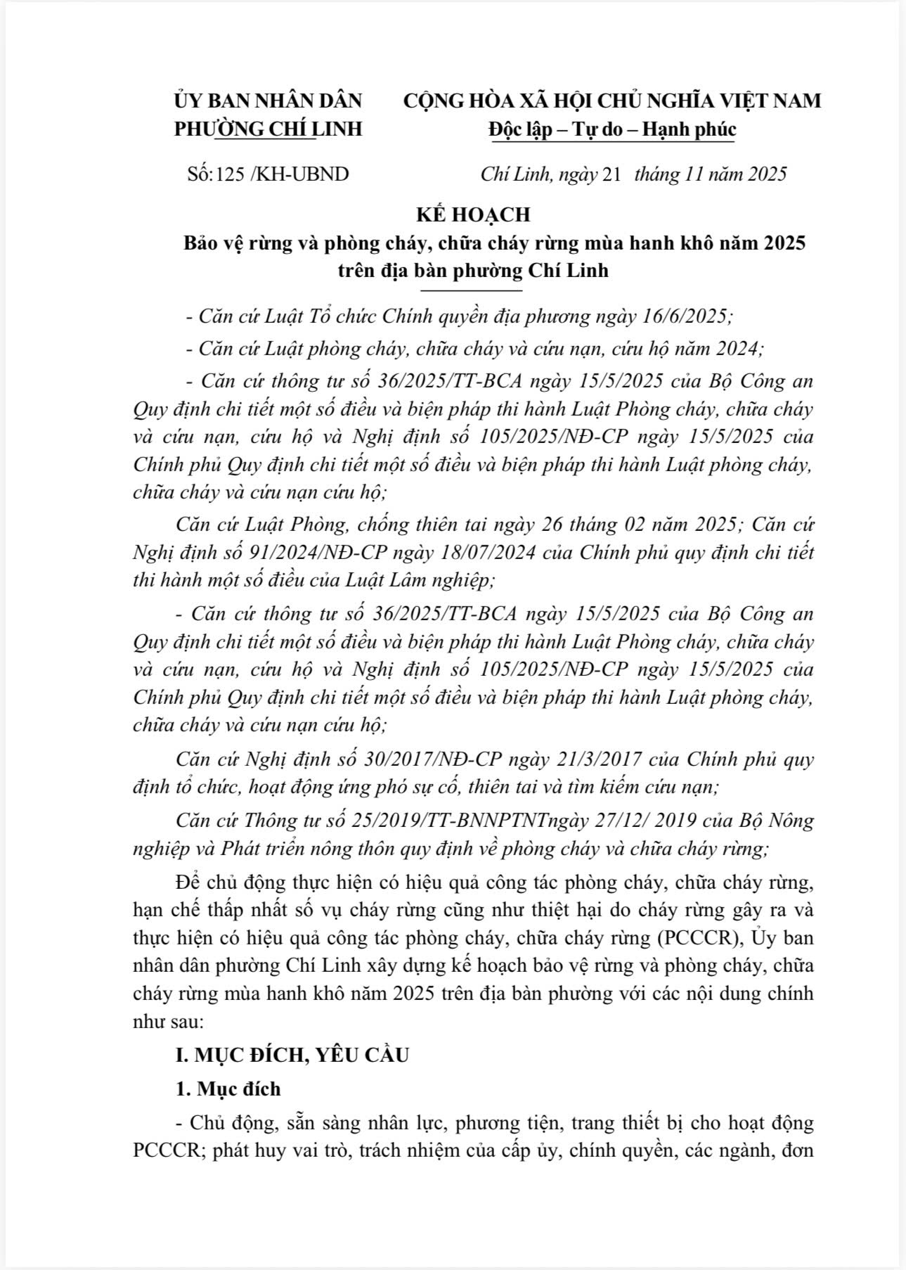 KẾ HOẠCH BẢO VỆ RỪNG VÀ PHÒNG CHÁY, CHỮA CHÁY RỪNG MÙA HANH KHÔ NĂM 2025 TRÊN ĐỊA BÀN PHƯỜNG CHÍ LINH.