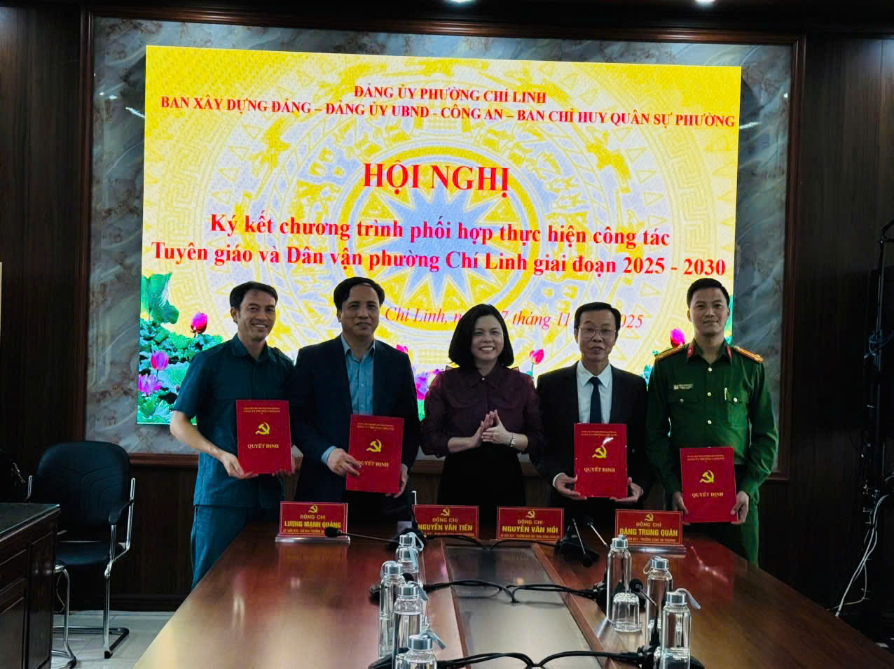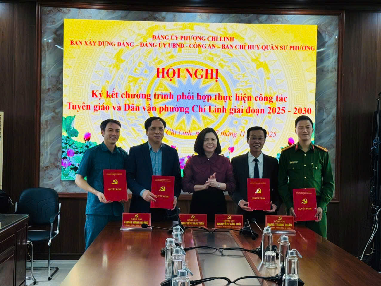 Hội nghị kí kết Chương trình phối hợp thực hiện công tác Tuyên giáo và Dân vận phường Chí Linh giai đoạn 2025-2030 giữa Ban Xây dựng Đảng - Đảng Ủy phường; Ủy ban nhân dân phường; Công an phường; Ban chỉ huy quân sự phường.